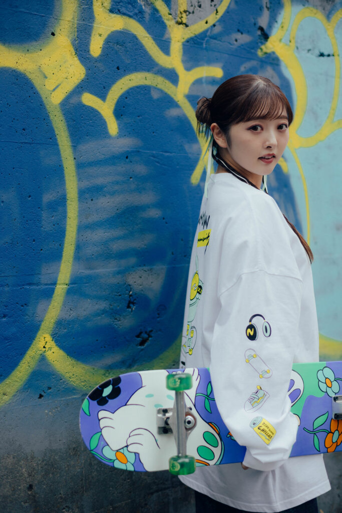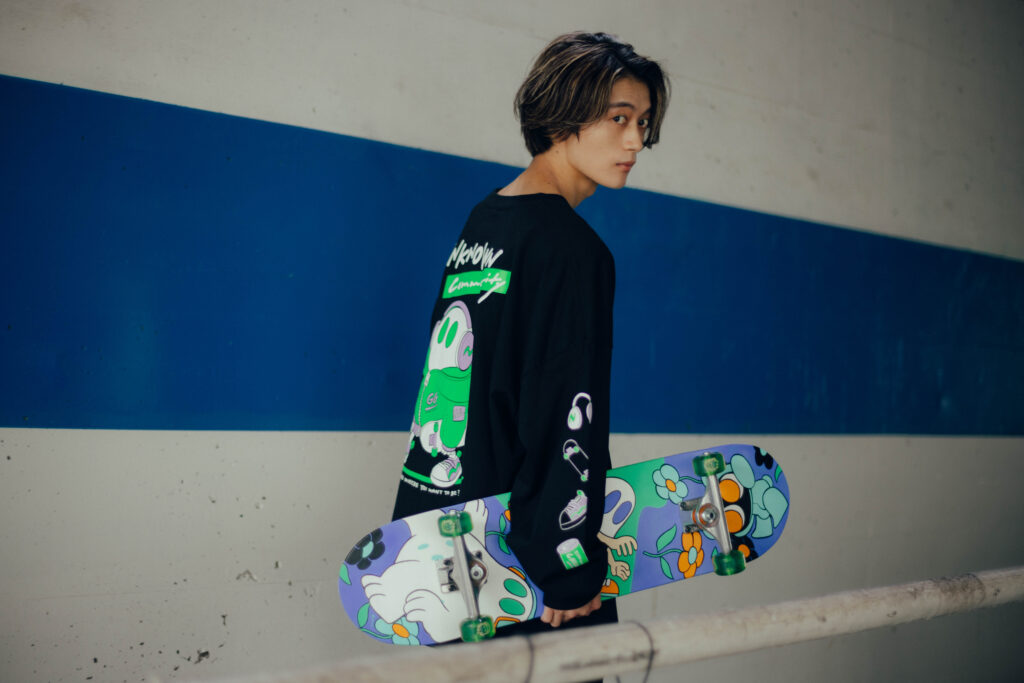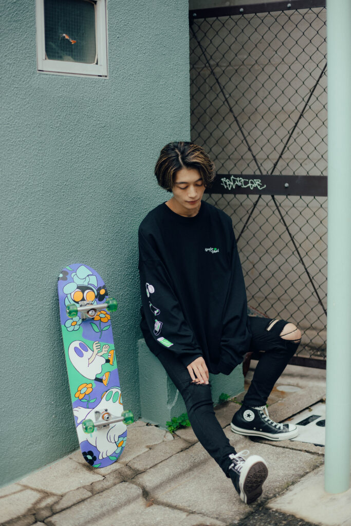 スケボーに寝そべるおばけ