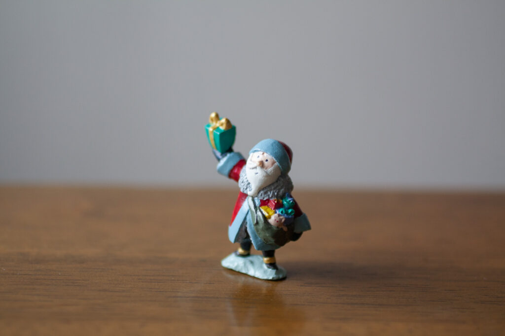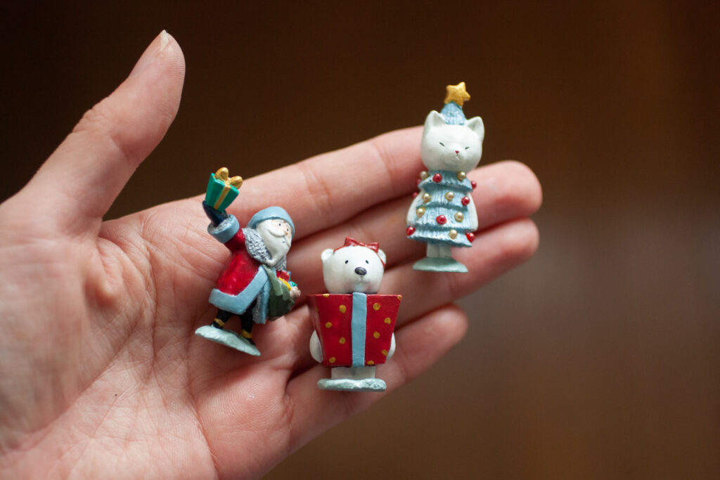 毎年開催させていただいている、クリスマスオーナメント展用のミニフィギュア。外国のお土産屋さんで売ってる風のミニフィギュア。おばちゃんが筆で塗ってそうな感じにしたくてぺたぺた筆で塗っています。これを機に「小さいフィギュア作るの楽しい…」となり、よく年おばけちゃんのミニフィギュアが生まれることとなります。